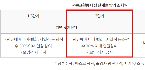 교회 등에서 종교활동을 하실때에는 코로나 2단계에서 정규예배 및 미사, 법회 등을 하실때 좌석수의 20%이내에서 인원참여가 가능합니다. 모임과 식사는 금지됩니다.