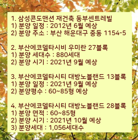 부산아파트 분양 일정과 계획을 알려드렸습니다.
