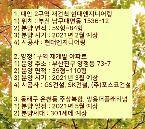 위에 2021 부산 아파트 분양예정 및 계획은 참고정도로 체크하시기 바라며, 정확한 분양가, 청약 일정, 평면도 등은 추후 입주자 모집공고에서 읽고 준비하시기 바랍니다.