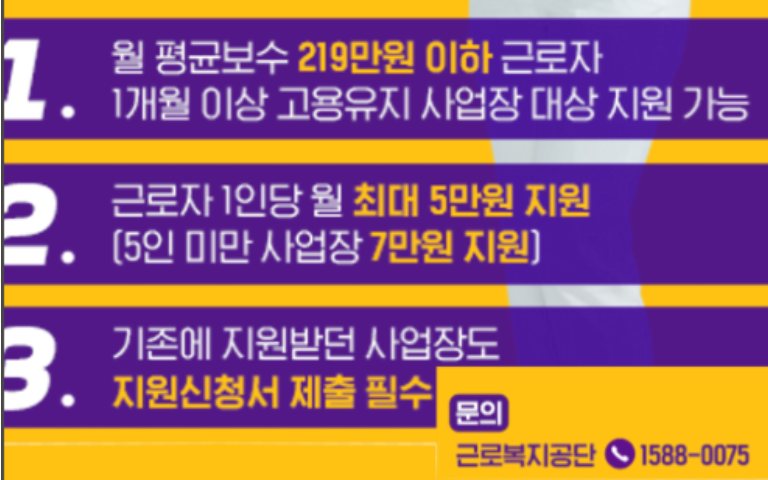 2. 근로자 1인당 월 최대 5만원 지원금을 지급합니다.