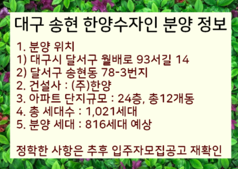 또한 아래에서 대구 송현 한양수자인 아파트 분양도 알려드립니다.