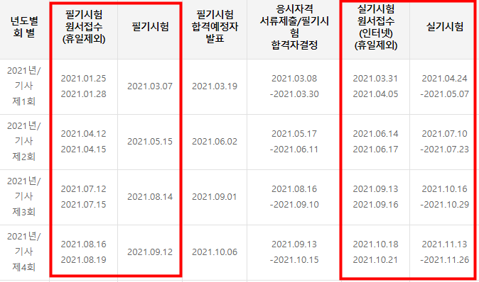 이렇게 2021년 기사시험일정을 정리해서 알려드렸습니다.