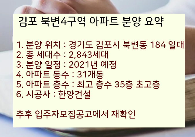 이번에 알려드릴 아파트 분양정보는 김포 북변4구역에 위치한 아파트입니다.