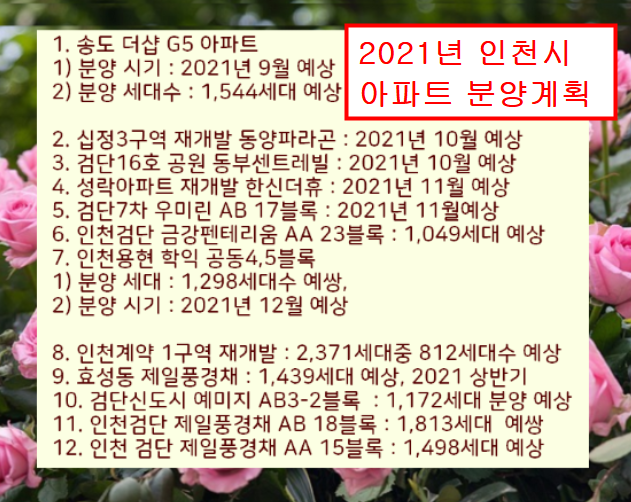 2021년 인천시 아파트 분양계획을 아래에 정리해놨으니, 인천시 아파트 분양정보를 찾는분들은 참고하세요.