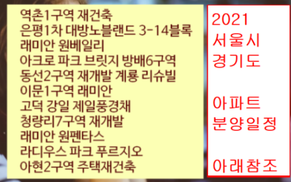 2021년 서울시, 경기도 아파트 분양일정들을 모아서 정리하였으니 살펴보기 바랍니다.