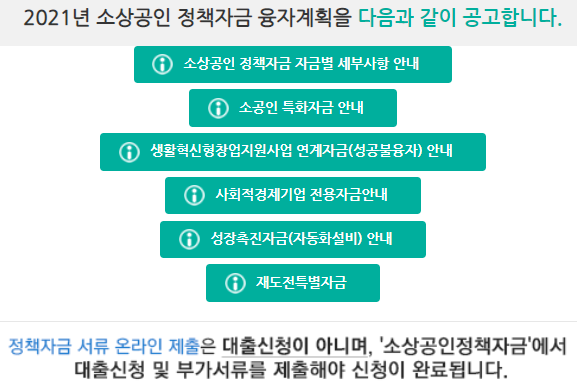 정책자금 지원사업소상공인정책자금정책자금 2021년 소상공인 정책자금 융자계획을 다음과 같이 공고합니다. 소상공인 정책자금 자금별 세부사항 안내 소공인 특화자금 안내 생활혁신형창업지