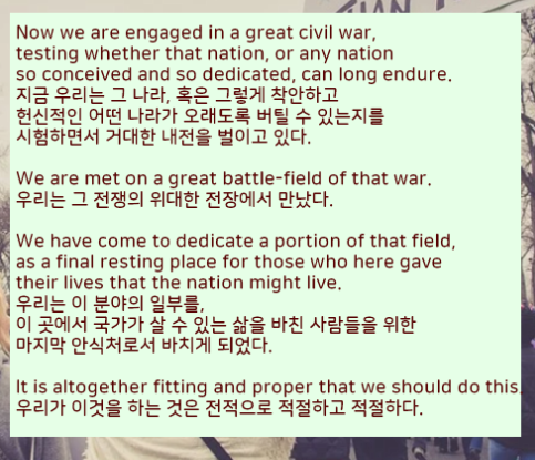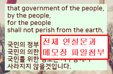 그만큼 링컨 대통령의 게티즈버그 연설문은 민주주의가 무엇인지 알려주는 좋은 인용문구가 많다고 생각합니다. 영어 연설문 전문을 번역해서 올려드렸으니 공부에 참고하시기 바랍니다.