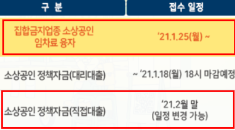 아래 자세한 사항을 참고하시기 바라며, 추가로 집합금지업종은 소상공인 임차료 융자 지원이 가능합니다.