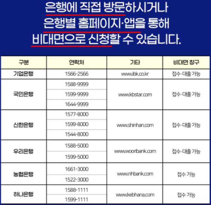 그리고 신청방법은 위에서 알려드린 은행별로 신청하시면 됩니다.
