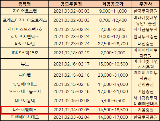 보시듯이 2월에는 나노씨엠에스말고도 다른 공모주 청약들이 많습니다.
