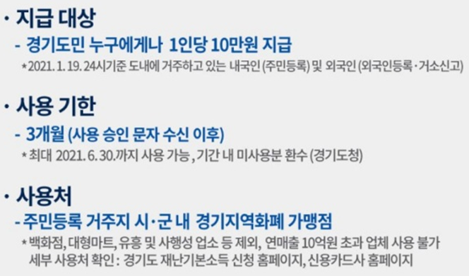 3. 지원금 사용처 : 주민등록거주지 시군내에 경긷지역화폐 가맹점에서 사용하실수있습니다.
