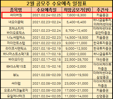 그리고 싸이버원 공모주 수요예측 일정과 더불어 2월 수요예측표도 같이 올려드렸습니다.