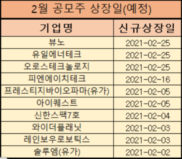 또한 2021년 2월에 상장될 공모주 일정표를 첨부하였으니 참고하시기 바랍니다.