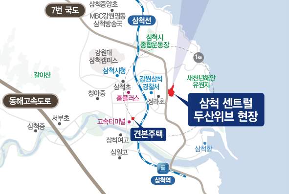 삼척 센트럴 두산위브 아파트 분양위치의 입지적인 장점과 주변 교육, 교통시설 등 인프라 시설도 살펴보겠습니다.