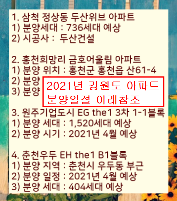 아파트 분양에 관심있는 청약 지원자분에게 유용한 팁들을 알려드리겠습니다. 우선 2021년 강원도 아파트 분양계획를 정리하였습니다. 2021 강원도 아파트 분양 예정 일정들을 참조하세요. 1. 삼