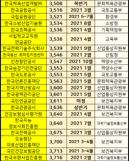 2021년 공기업별로 채용인원이 많은 기관별로 연봉을 간략적으로 살펴보겠습니다.