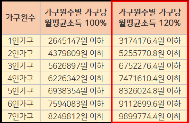 또한 첨부해드린 2020 도시근로자 월평균 소득구간표에서 100% 이하를 충족해야합니다.