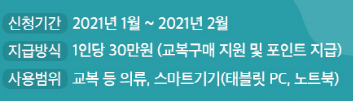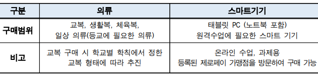 2. 구입가능 물품 : 교복, 생활복, 체육복, 일상의류, 태블릿 PC, 원격수업 스마트 기기