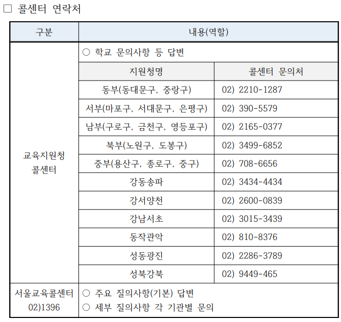 또한 서울시 교육콜센터 02-1396으로 전화하셔서 주요 질의사항과 답변 등 문의를 하실수있다고 합니다.