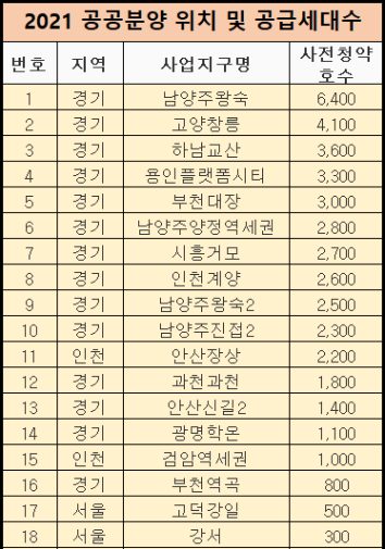 2021년 공공분양 일정(서울, 경기도, 인천 아파트)