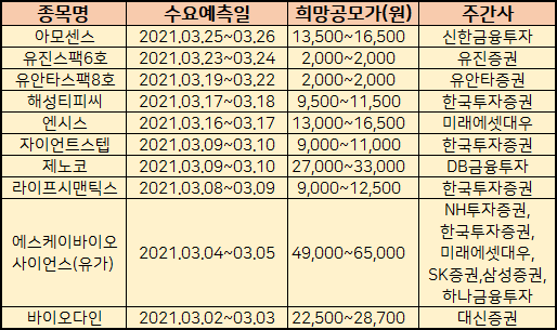 3월에도 10개 내외의 신규 상장주들이 있습니다. 2021년 3월 공모주 청약일정을 정리하였습니다. sk바이오 사이언스, 네오이뮨택 등 상장주들을 살펴보겠습니다. 3월에 상장 예정인 공모주들중에
