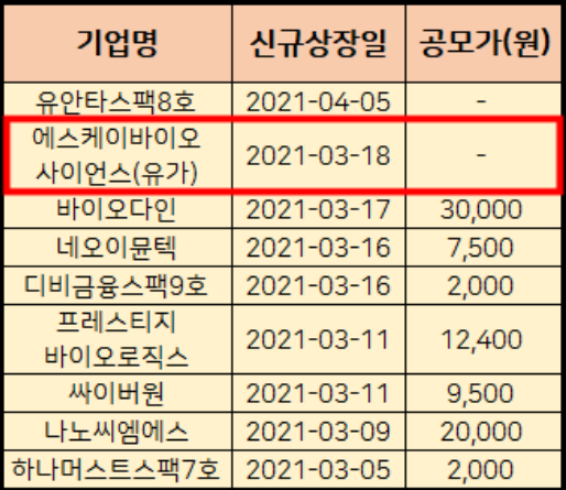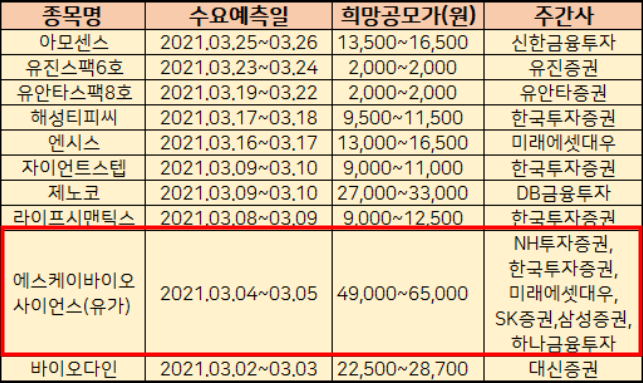 3월에도 10개 내외의 신규 상장주들이 있습니다. 2021년 3월 공모주 청약일정을 정리하였습니다. sk바이오 사이언스, 네오이뮨택 등 상장주들을 살펴보겠습니다. 3월에 상장 예정인 공모주들중에