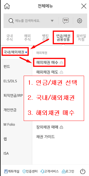 두번쨰로 '연금/채권 금융상품'을 선택하고 '국내/해외채권'에 들어갑니다.