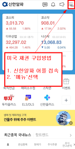 우선 신한금융투자 알파에서 미국 채권을 투자하는 방법을 그림처럼 따라하시면 됩니다.