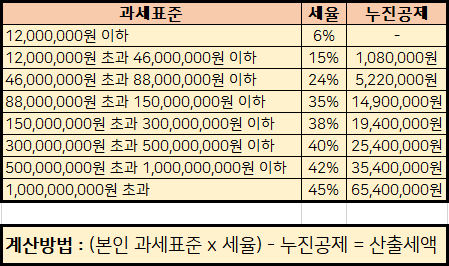 세번째. 과세표준에서 세율을 곱하고 누진공제를 빼면 산출세액이 결정됩니다.
