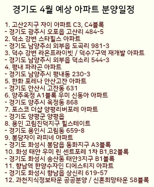 첫번째로 경기도의 4월에 분양을 아파트 목록을 정리했습니다.