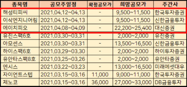 2021년 4월 공모주 청약일정표를 첨부해드렸으니 참고하시기 바랍니다.
