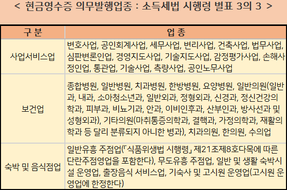 2021년부터 적용되는 추가된 현금영수증 의무발행업종 사업체 목록도 위에 첨부해놨으니 참고하시기 바랍니다. 현금영수증은 기본적으로 고객이 원하면 가게에서 발행해줘야함을 잊지마시기 바랍니다.