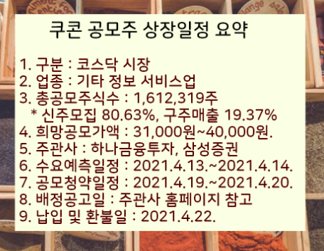 쿠콘 상장 주관사는 삼성증권과 하나금융투자이며 청약일은 2021년 4월19일부터입니다.