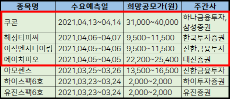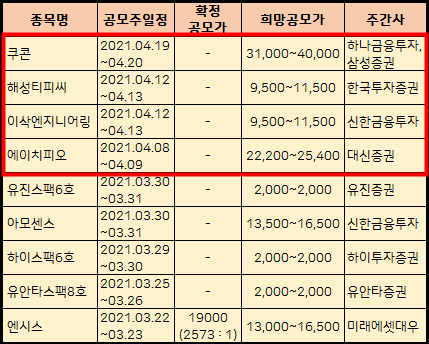 위에 2021년 4월 주식 공모주 IPO 청약일정을 표로 남겨놨으니 두고두고 참고하시기 바랍니다.