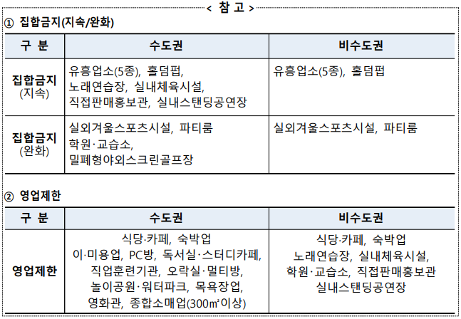 1. 지속 집합금지업종 : 유흥업종, 홀덥펍, 노래방, 실내체육시설, 홍보관 등