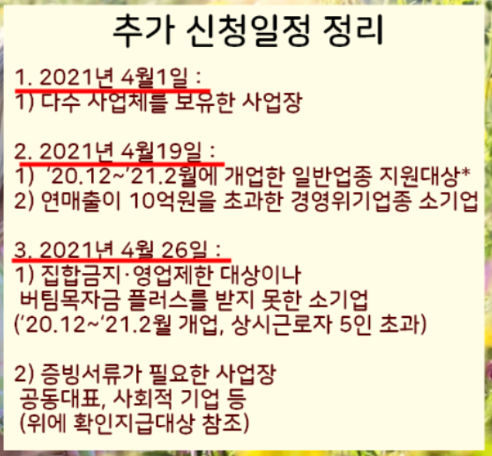 또한 경영위기업종중에 연매출이 10억을 초과하는 소기업의 경우에는 2021년 4월19일부터 신청가능할 예정인데요.