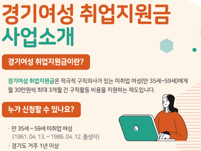 경기 여성 취업지원금은 경기도에 1년 이상 거주한 분들 대상으로합니다.