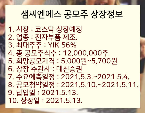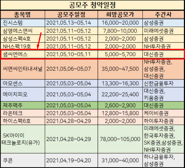 샘씨엔에스 청약일정은 2021년 5월10일부터 5월11일까지 2일동안 진행합니다.