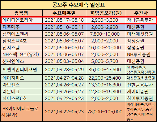 위에서 2021년 5월까지 신규상장 공모주 청약일정표를 첨부해드렸습니다.