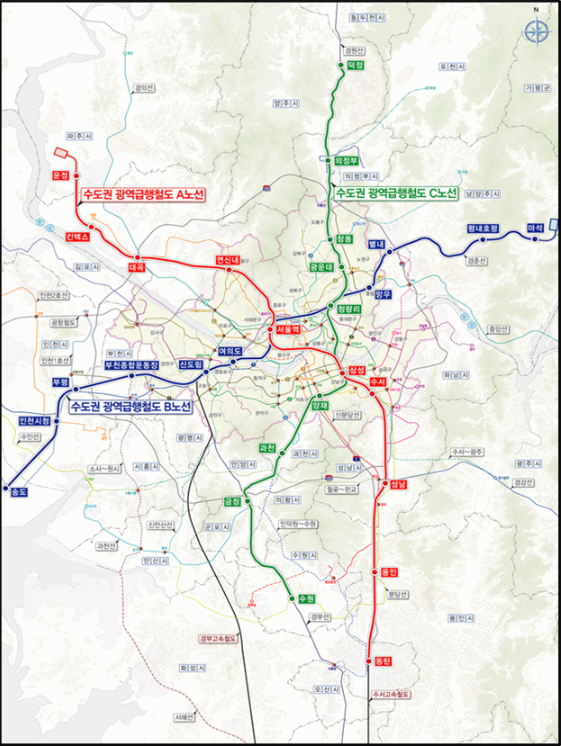 아래에 수도권 gtx a노선, b노선, c노선까지 합쳐서 노선도를 첨부해놨습니다.