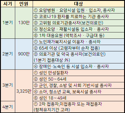 정리해보면 일반인들이 모두 코로나 백신 예방접종 받는 시기는 3분기인 7월부터라고 보시면됩니다.