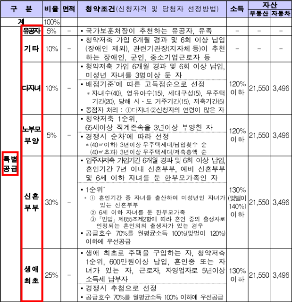 4. 신혼부부 특별공급 : 혼인 7년이내, 예비부부, 6세 이하 자녀를둔 한부모가정