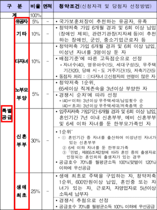 2. 특별공급 사전청약 : 신혼부부, 다자녀가구, 노부모부양, 일반 기관추천, 생애최초 특별공급