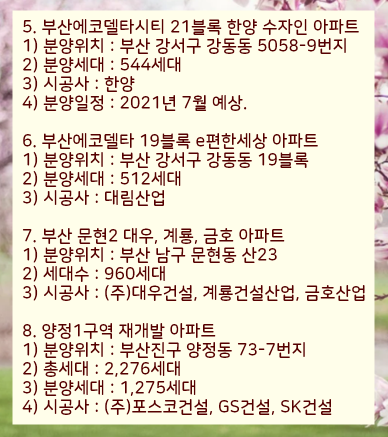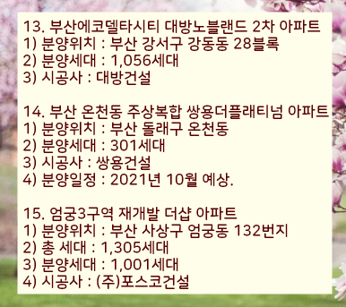 위에서 알려드린 5월~12월 부산 분양예정 아파트 계획을 확인하시고 청약 지원하시기 바랍니다.