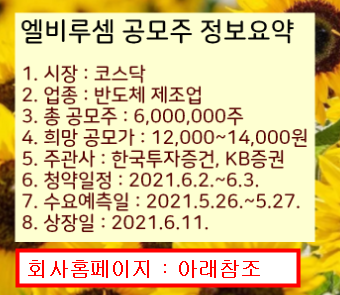 엘비루셈 공모주 청약은 2021.6.2.~6.3.동안 진행합니다.