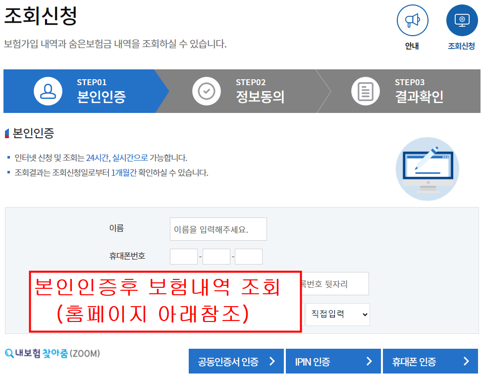 1. 생명보험협회 통합조회시스템 홈페이지에서 이름과 휴대전화번호, 이메일 등을 입력합니다.