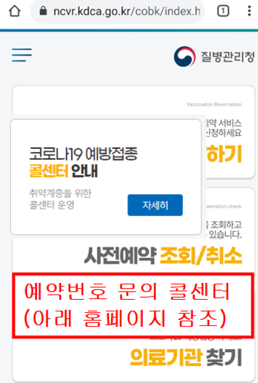 문자를 못받으셨으면 홈페이지(ncvr.kdca.go.kr)에서 상담센터 번호가 나와있습니다.