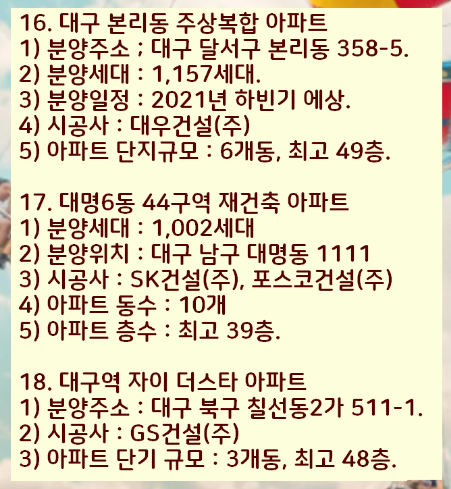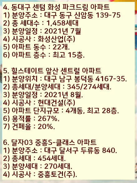 대구 7~12월까지 분양하는 인기있는 아파트들 일정을 정리하였습니다.