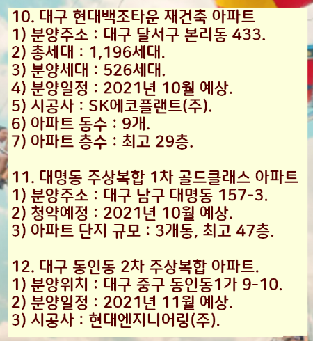 알려드린 대구시에서 7월부터 12월까지 분양하는 아파트 청약 예정 일정은 참고로 읽어보시고 정확한 청약일정과 분양가, 평면도 등은 시공사 홈페이지에서 재확인하시기 바랍니다.