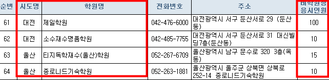 학원 목록표에서 세부사항이 잘 안보이는분들은 맨 아래쪽에 한국교유과정평가원 홈페이지에세 엑셀파일로 올려놨으니 엑셀파일을 받아서 확인하세요.